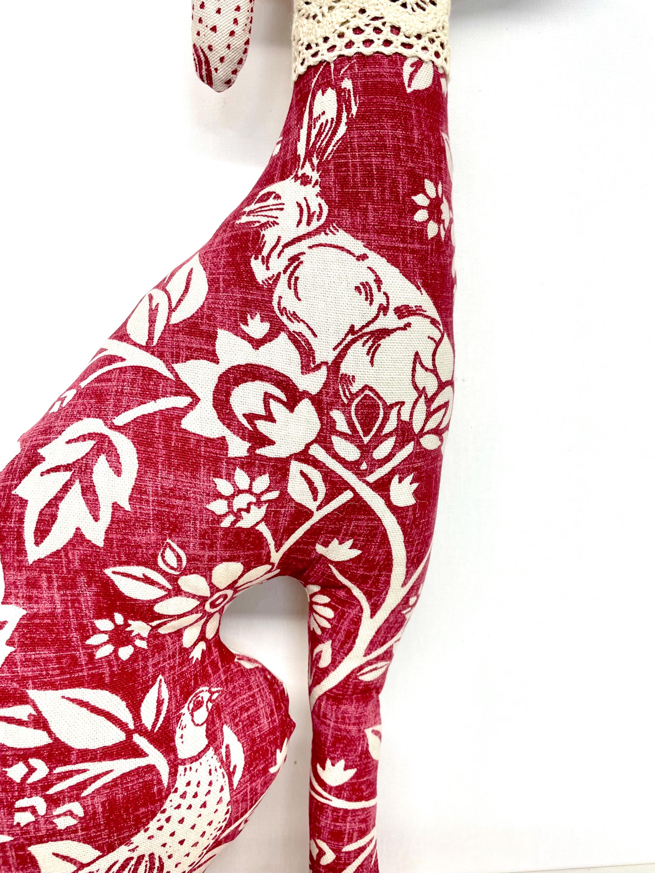 Made with a beautiful deep red woodland fabric she has a ribbon collar.